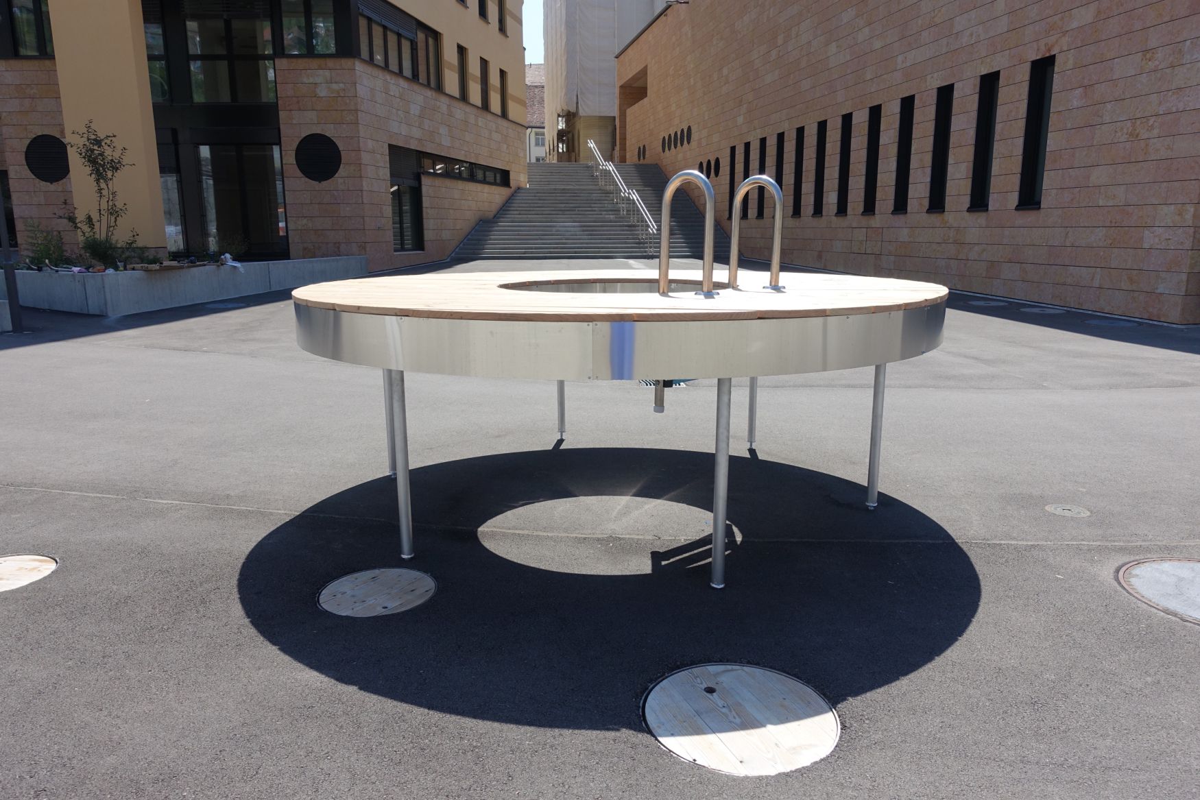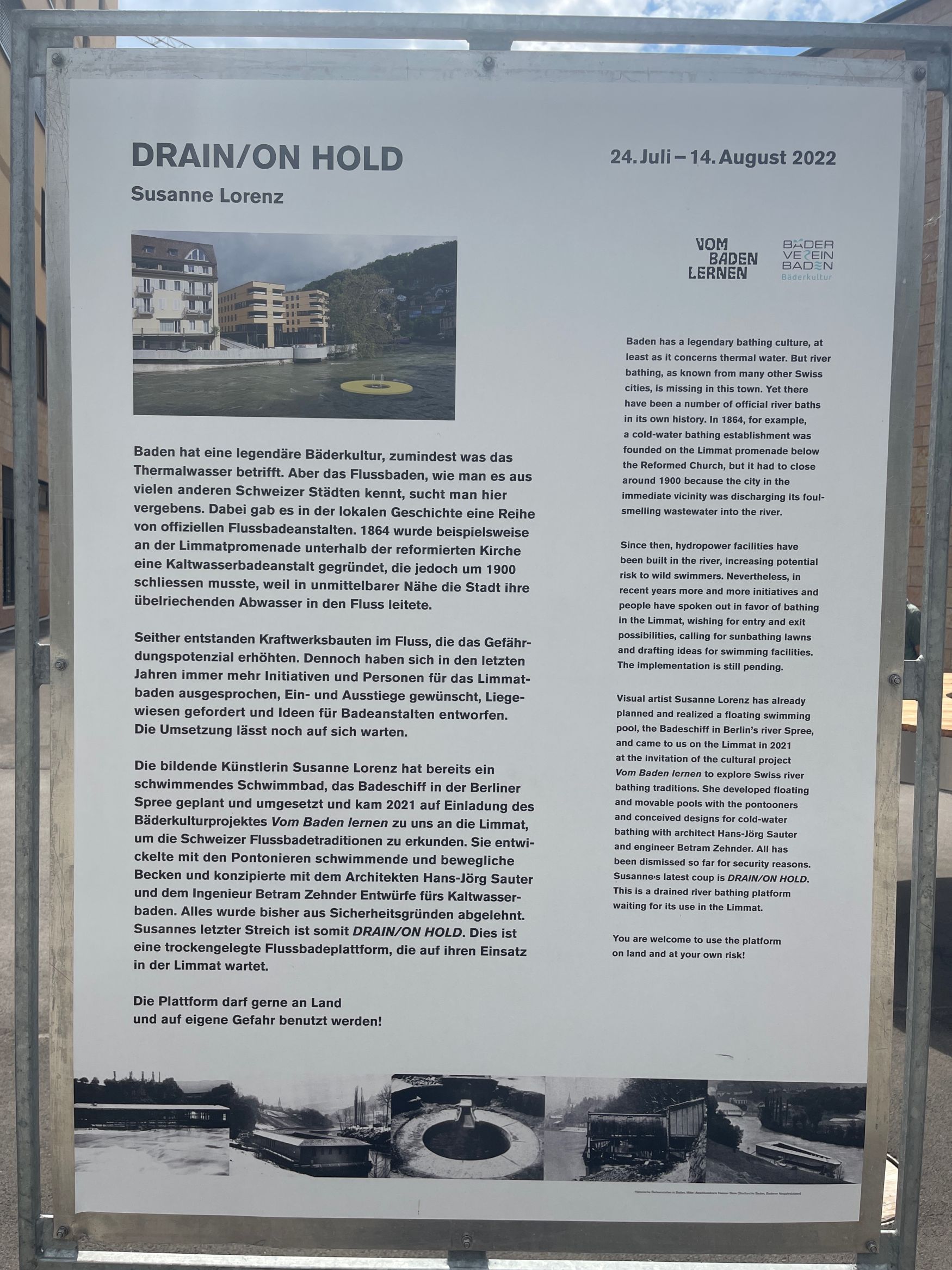 Susanne Lorenz ist bildende Künstlerin und Professorin an der Universität der Künste Berlin und hat bereits ein Badeschiff an der Spree gebaut – ein schwimmendes Schwimmbad mit Bezug zur dortigen Bädergeschichte. Am Badener Ufer zeigt sie mit drain/on hold eine trockengelegte Flussbadeplattform, die auf ihren Einsatz wartet. Damit bezieht sie sich auch auf die vielen Flussbad-Initiativen vor Ort, die bisher noch erfolglos geblieben sind.