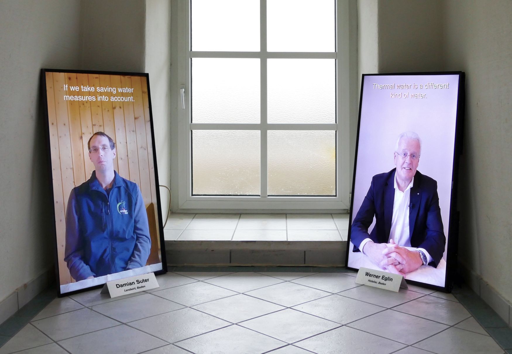 So werden in einer Arbeit der Eigentümer des Badener Hotels Limmathof mit einem lokalen Landwirt in einen fiktiven Dialog darüber gebracht, wie sie den Wert des Wassers ganz unterschiedlich einschätzen. In den mobilen Videoclips «Fragen über Fragen rund ums Baden» wird der Umgang mit Nacktheit und Bekleidungsnormen im öffentlichen Raum thematisiert. Eine andere Installation verfolgt den Weg des Thermalwassers zu seinem vermuteten Ursprung. Und in der filmischen Miniatur «Wave to Heaven» wird gefragt, wie man mit dem Stress umgeht, der entsteht, wenn man sich in den Badener Bädern unbedingt entspannen will. Darüber hinaus werden Malereien und Skulpturen von Studierenden des Studiengangs Kunst und Vermittlung der Hochschule Luzern – Design und Kunst zu sehen sein, beispielsweise die Arbeit von Nathalie Specker, die die gerade erst errichtete Wellness-Therme als zukünftiges archäologisches Relikt ausstellt.